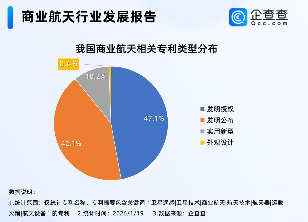 企查查数据显示,截至目前,我国现有2.1万项商业航天相关专利,从类型上来看,发明专利最多,合计占比近9成。其中,发明授权类型专利占比47.1%,其次是发明公布,占比42.1%。2025年全年,我国商业航天相关专利申请量超2300项。