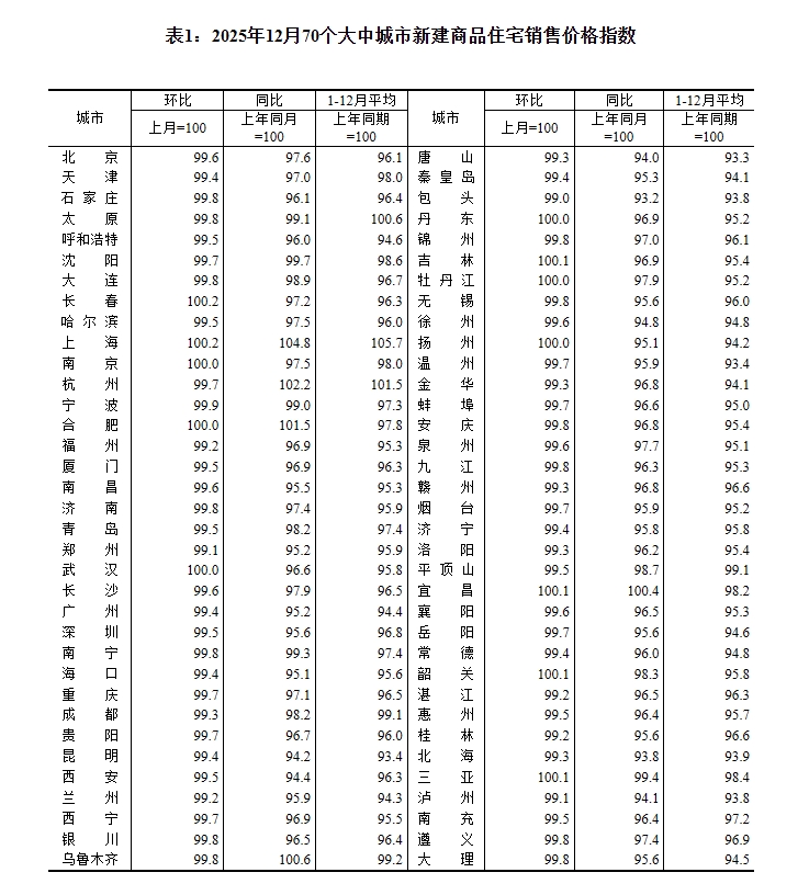 2025年12月份70个大中城市商品住宅销售价格变动情况