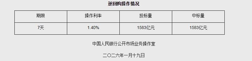 中新网1月19日电据央行网站消息,2026年1月19日中国人民银行以固定利率、数量招标方式开展了1583亿元7天期逆回购操作。具体情况如下: