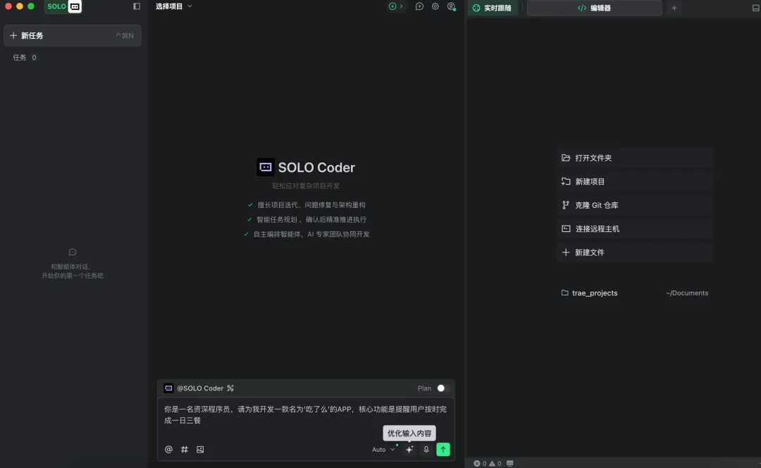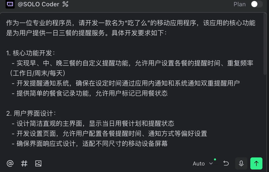 蓝鲸记者实测了多款AI编程工具,以市面上较热门的Trae为例,用户只需在指令框中输入需求,如“你是一名资深程序员,请为我开发一款名为吃了么的APP,核心功能是提醒用户按时完成一日三餐”。
