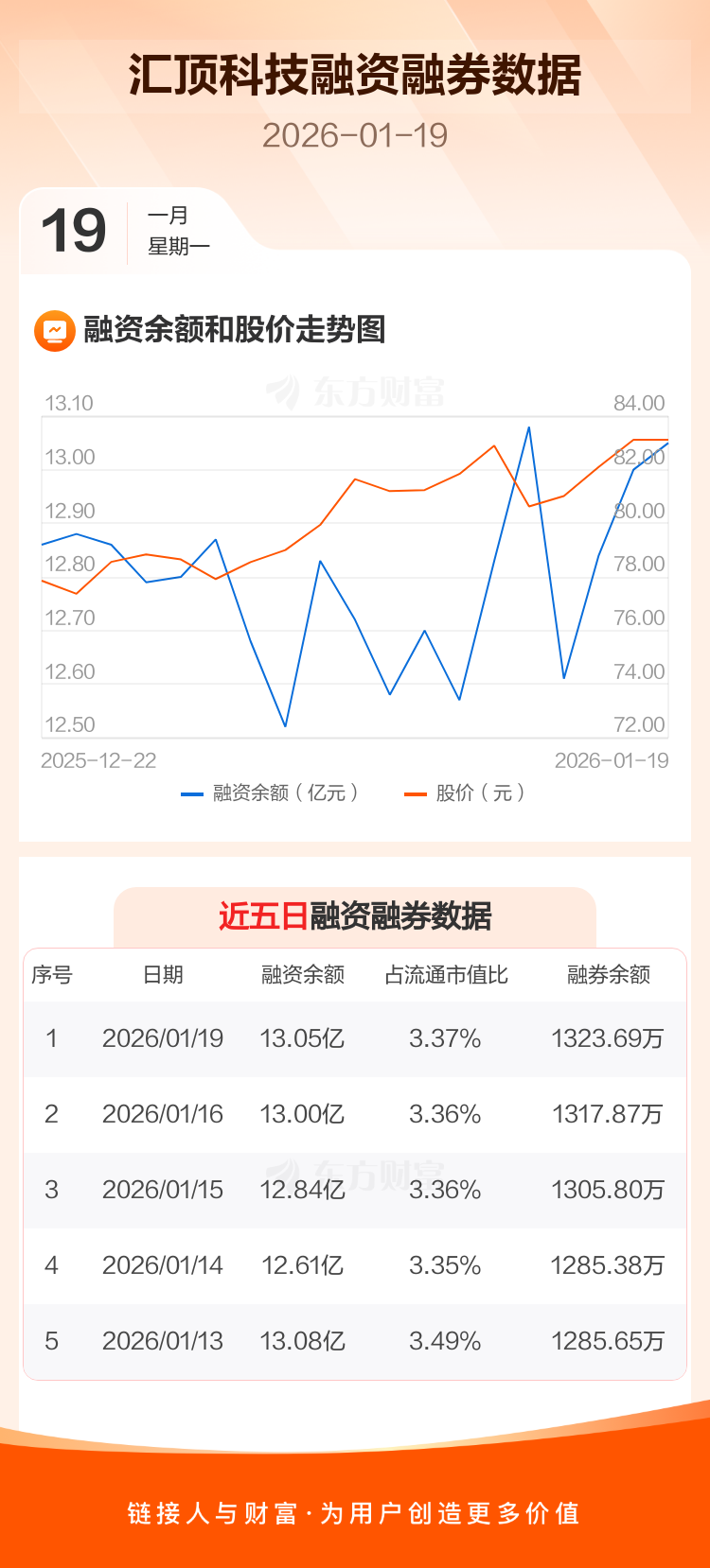 交易所最新数据显示,汇顶科技于2026年1月19日获融资买入5466.98万元,融资偿还5016.76万元,当日融资净买入450.22万元。目前,该股融资余额13.05亿,占流通市值比例为3.37%。