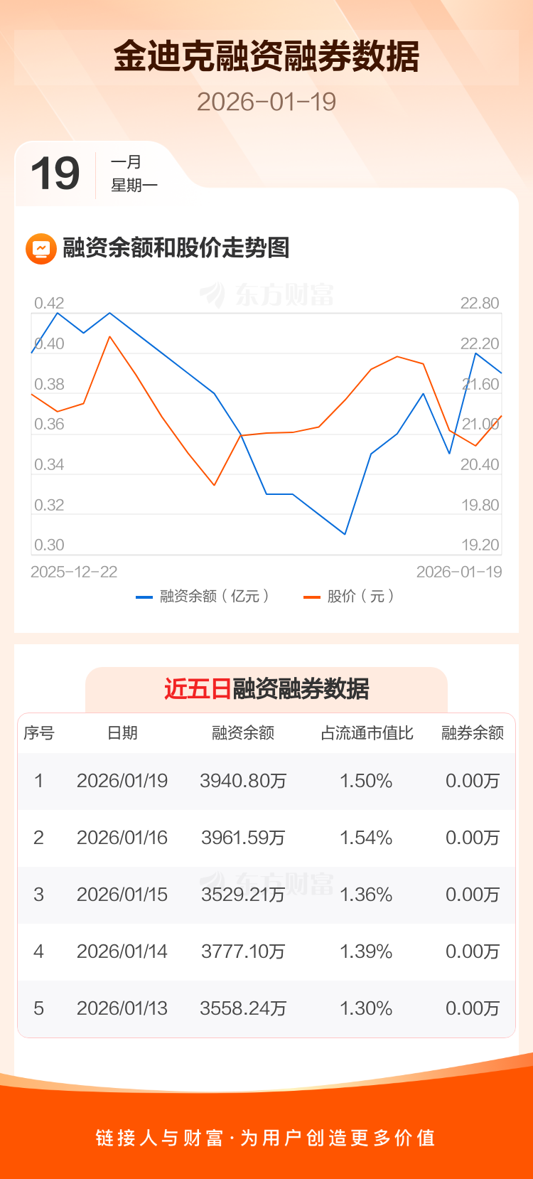 交易所最新数据显示,金迪克于2026年1月19日获融资买入261.01万元,融资偿还281.80万元,当日融资净偿还20.78万元。目前,该股融资余额3940.80万,占流通市值比例为1.50%。