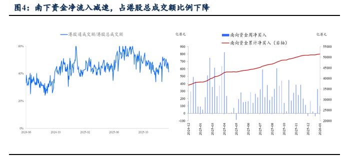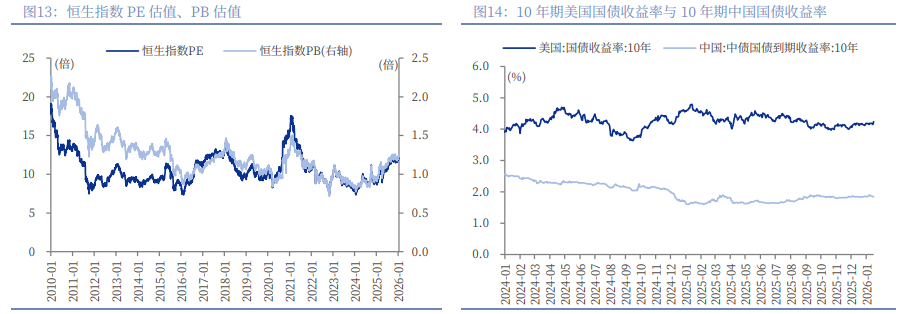 港股估值与风险偏好:(1)截至2026年1月16日,恒生指数的PE、PB分别为12.20倍、1.24倍,分别较上周五上涨0.44%、0.52%,分别处于2010年以来80%、58%分位数水平。(2)10年期美国国债到期收益率较上周五上行6BP至4.24%,港股恒生指数的风险溢价率为3.95%,为3年滚动均值-1.87倍标准差,处于2010年以来3%分位。10年期中国国债到期收益率较上周五下行3.58BP至1.8424%,从而港股恒生指数的风险溢价率为6.35%,为均值(3年滚动)-1.76倍标准差,处于2010年以来39%分位。(3)恒生沪深港通AH股溢价指数较上周五下降2.30点至120.43,处于2014年以来17%分位数的水平。