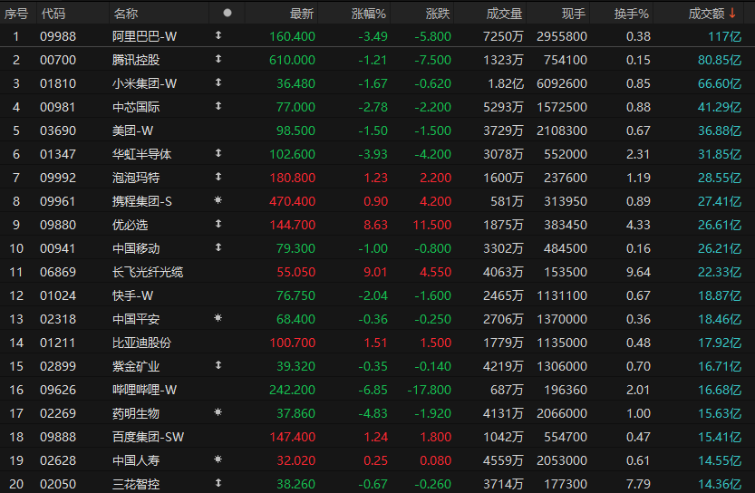 港股成交额前二十
