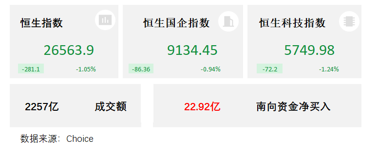 盘面上,作为市场风向标的大型科技股集体表现弱势,阿里巴巴跌3.49%,小米再创阶段新低;近期热门的AI应用概念股继续跌势,AI医疗概念方向跌幅相对较大,生物医药股亦集体走低;铜业股、苹果概念股、中资券商股、保险股多数表现萎靡。另一方面,市场看好航空行业量价齐升复苏趋势,东方航空港股大涨超9%表现抢眼;电力设备股、军工股、石油股、汽车股、港口航运股、黄金股多数活跃。