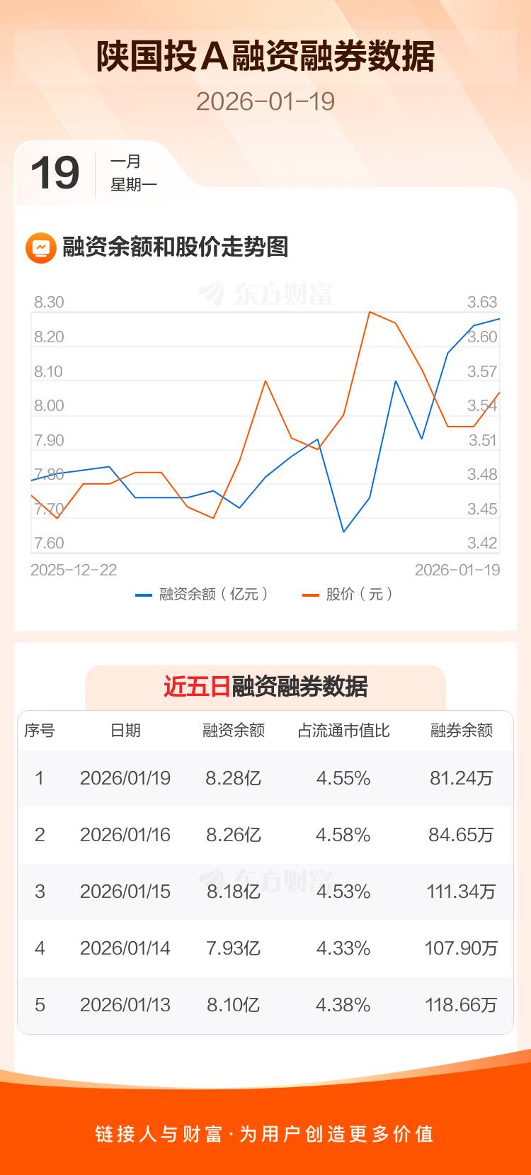交易所最新数据显示,陕国投A于2026年1月19日获融资买入3277.18万元,融资偿还3073.24万元,当日融资净买入203.94万元。目前,该股融资余额8.28亿,占流通市值比例为4.55%。