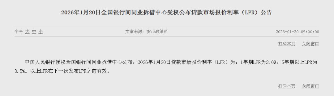 据中国人民银行1月20日消息,中国人民银行授权全国银行间同业拆借中心公布,2026年1月20日贷款市场报价利率(LPR)为:1年期LPR为3.0%,5年期以上LPR为3.5%。以上LPR在下一次发布LPR之前有效。
