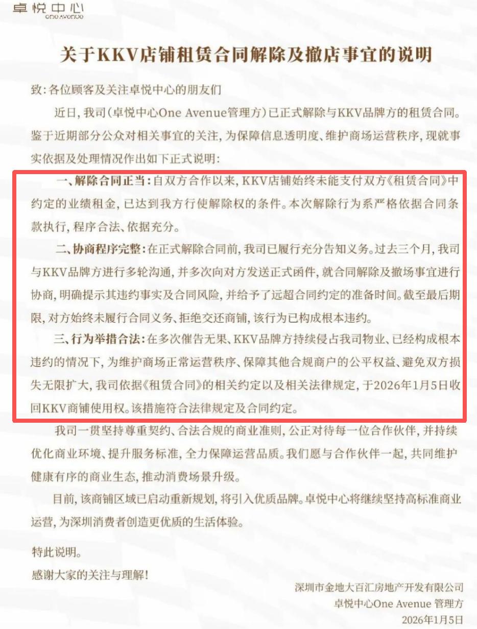 卓悦中心的说法是,KKV自开业以来经营效率低于同类主力店,长期未产生业绩提成租金,已构成根本违约。商场称,在最终清退前,已进行数月沟通、多次正式催告,并提供近44万元运营支持。