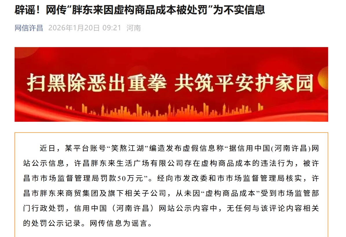 每经AI快讯,1月20日,据“网信许昌”消息,近日,某平台账号“笑熬江湖”编造发布虚假信息称“据信用中国(河南许昌)网站公示信息,许昌胖东来生活广场有限公司存在虚构商品成本的违法行为,被许昌市市场监督管理局罚款50万元”。经向市发改委和市市场监督管理局核实,许昌市胖东来商贸集团及旗下相关子公司,从未因“虚构商品成本”受到市场监管部门行政处罚,信用中国(河南许昌)网站公示内容中,无任何与该评论内容相关的处罚公示记录。网传信息为谣言。