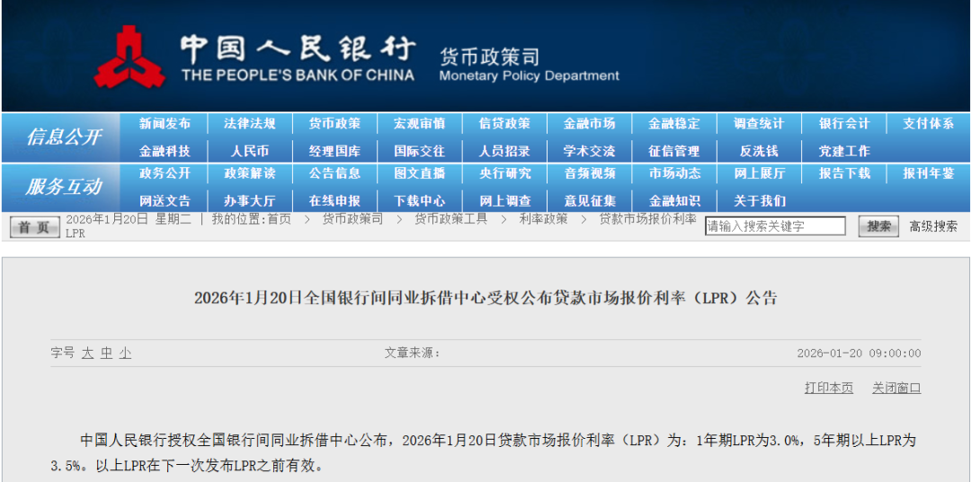 中国人民银行授权全国银行间同业拆借中心公布,2026年1月20日贷款市场报价利率(LPR)为:1年期LPR为3.0%,5年期以上LPR为3.5%。以上LPR在下一次发布LPR之前有效。