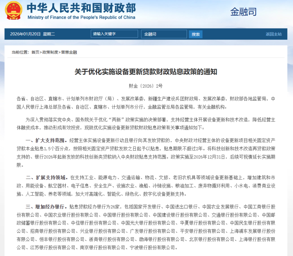 财政部等四部门1月20日对外发布通知,明确优化实施设备更新贷款财政贴息政策。此次优化扩大了政策支持范围,由设备购置贷款拓展至设备更新项目相关的固定资产贷款,并纳入再贷款政策支持的、2026年起新发放的科技创新类贷款;同时,增加政策支持领域,增加经办银行,优化贴息流程等。
