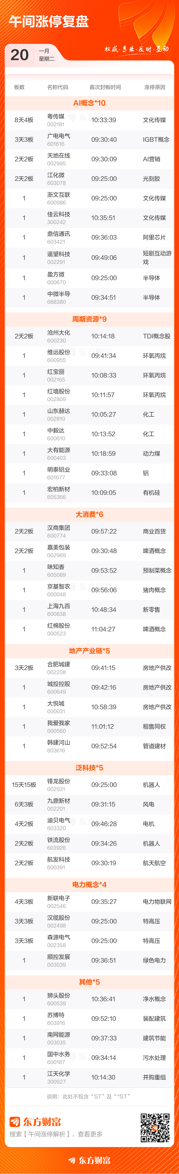 1月20日午间涨停复盘:52股涨停 粤传媒8天4板