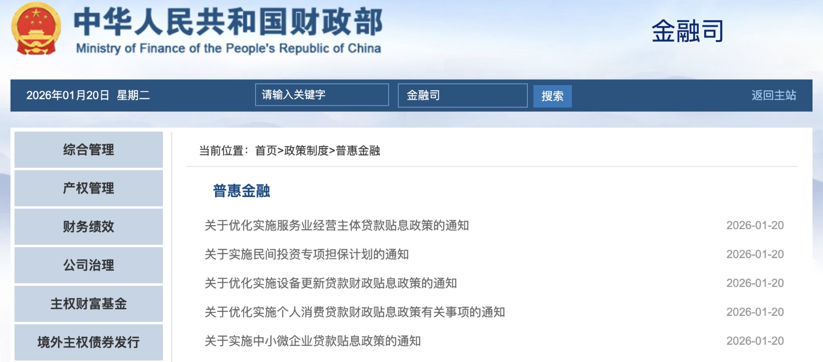 1月20日,财政部联合相关部门连发5份通知,分别是《关于实施中小微企业贷款贴息政策的通知》《关于优化实施个人消费贷款财政贴息政策有关事项的通知》《关于优化实施设备更新贷款财政贴息政策的通知》《关于实施民间投资专项担保计划的通知》《关于优化实施服务业经营主体贷款贴息政策的通知》。