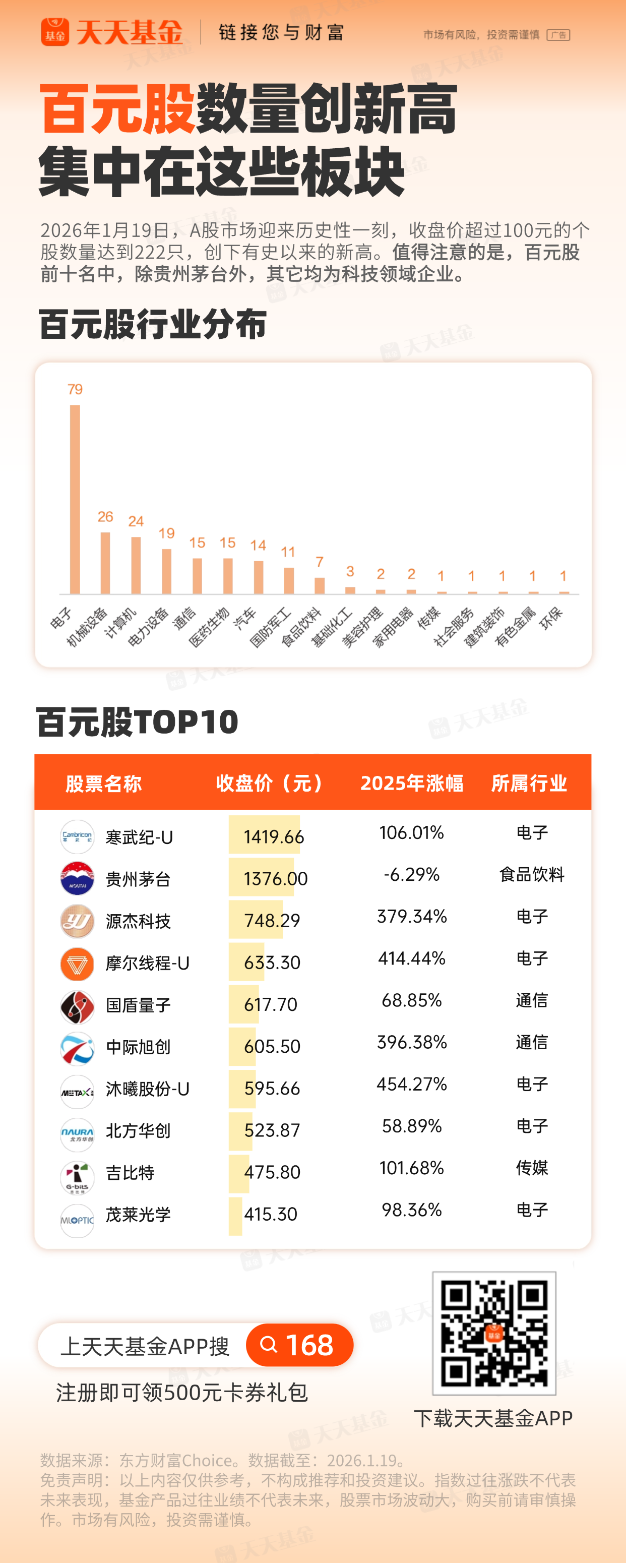 进入2026年以来,百元股数量再上新台阶,一举突破200只,截至1月19日已达222只。