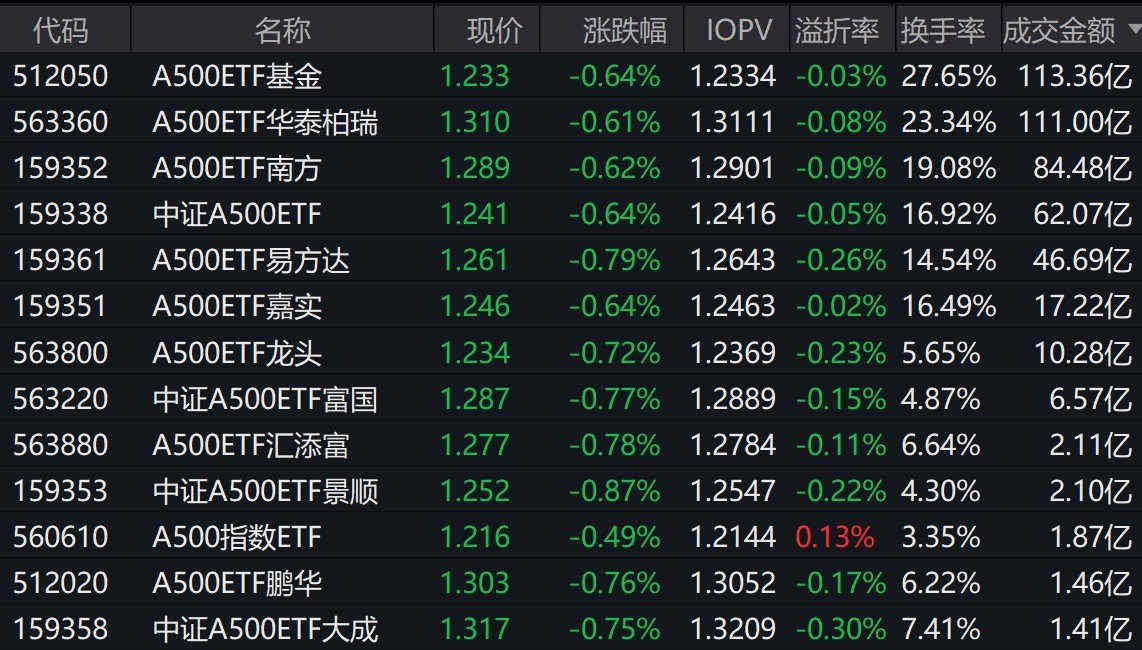 市场早盘震荡回落,中证A500指数下跌0.71%,2只中证A500相关ETF成交额超111亿元