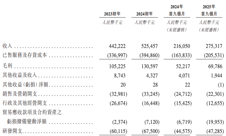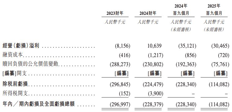2023财年、2024财年、2024年前九个月及2025年前九个月,公司录得经营溢利分别为-815.6万元、1063.9万元、-3512.1万元、-3046.5万元。相对应,年内/期内亏损分别为2.97亿元、2.28亿元、2.28亿元、1.14亿元,持续未实现盈利。