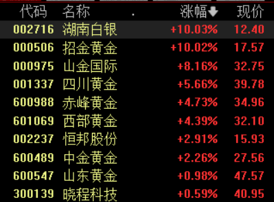 贵金属板块午后走强,湖南白银、招金黄金涨停。