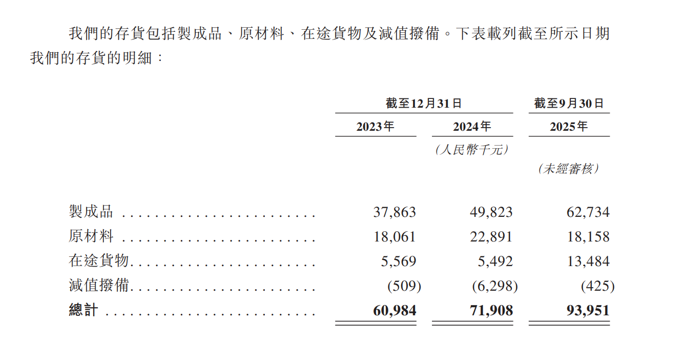 在袁记食品的存货构成中,制成品占比最高。2023年末,公司制成品金额为3786万元,2024年末增长至4982万元。2025年三季度末,存货中的制成品为6273万元,在途货物还有1348万元。