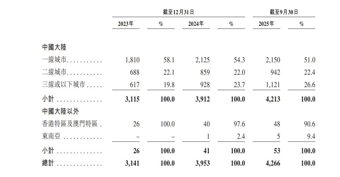 袁记云饺以加盟为主,袁记食品将包括馅料和面皮在内的主要原料出售给加盟商来获取绝大多数收入。2023年末公司在全球拥有3141家门店,2025年前三季度末门店数量达到4266家。