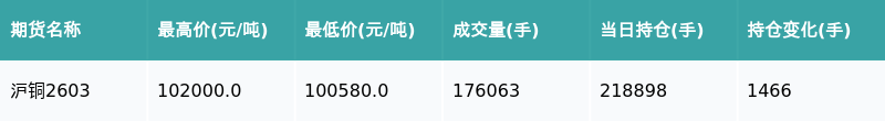 南财智讯1月20日电,盘后期货数据显示,上海期货交易所的沪铜主力合约收涨0.58%,收盘报101230.0元/吨,日内资金流入1.43亿元。其他相关指标见下表:
