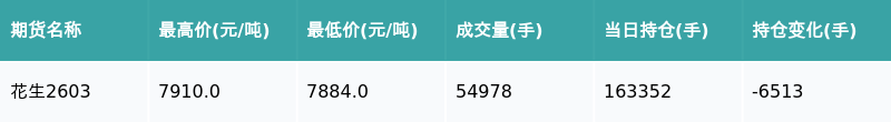 南财智讯1月20日电,盘后期货数据显示,郑州商品交易所的花生主力合约收涨0.25%,收盘报7906.0元/吨,日内资金流出3414.18万元。其他相关指标见下表: