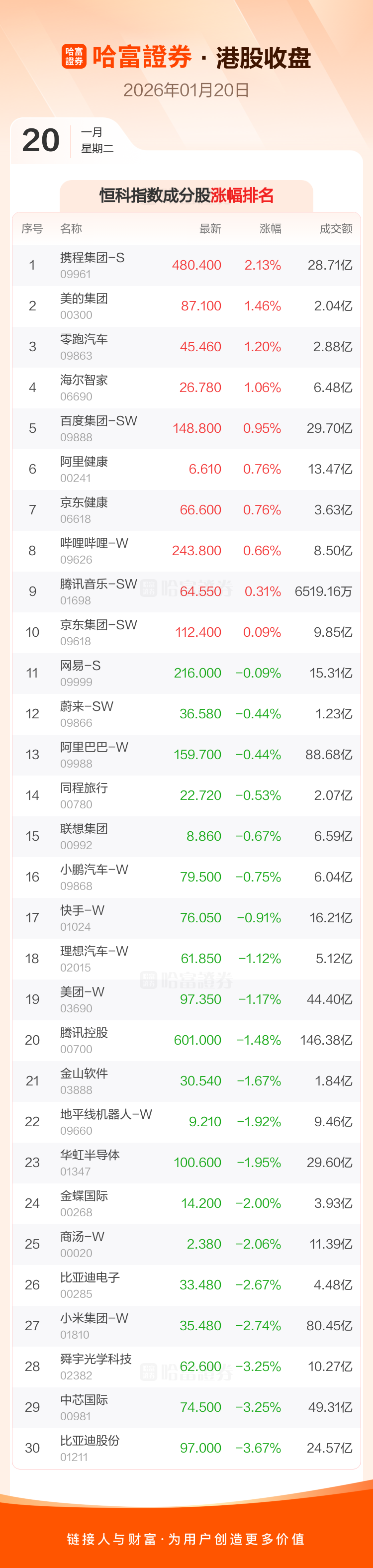 港股1月20日收盘走低 ,恒生指数收报26487.51点,跌76.39点,跌幅0.29%;恒生科技指数收报5683.44点,跌66.54点,跌幅1.16%。恒生指数成分股中泡泡玛特、中国人寿、华润置地涨幅居前,药明康德、比亚迪股份、中芯国际跌幅靠前。恒生科技指数成分股中携程集团-S、美的集团、零跑汽车涨幅居前,比亚迪股份、中芯国际、舜宇光学科技跌幅靠前。