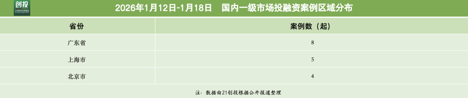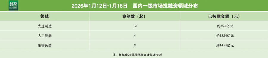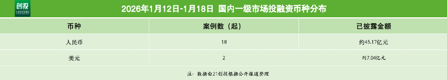 21创投不完全统计,2026年1月12日—1月18日,报告日期内国内一级市场发生融资事件27起。其中,有20笔融资披露了融资金额和币种信息,总规模约合人民币52.21亿元。