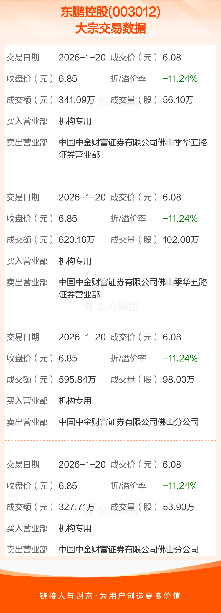 2026年1月20日,东鹏控股发生4笔大宗交易,共成交310.00万股,成交金额1884.80万元,占其流通市值比例为0.24%。