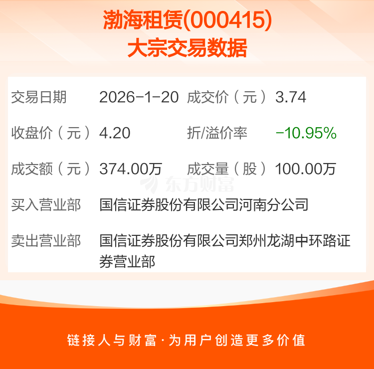 2026年1月20日,渤海租赁发生1笔大宗交易,共成交100.00万股,成交金额374.00万元,占其流通市值比例为0.02%。