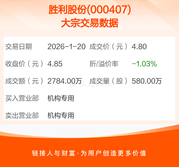 2026年1月20日,胜利股份发生1笔大宗交易,共成交580.00万股,成交金额2784.00万元,占其流通市值比例为0.66%。