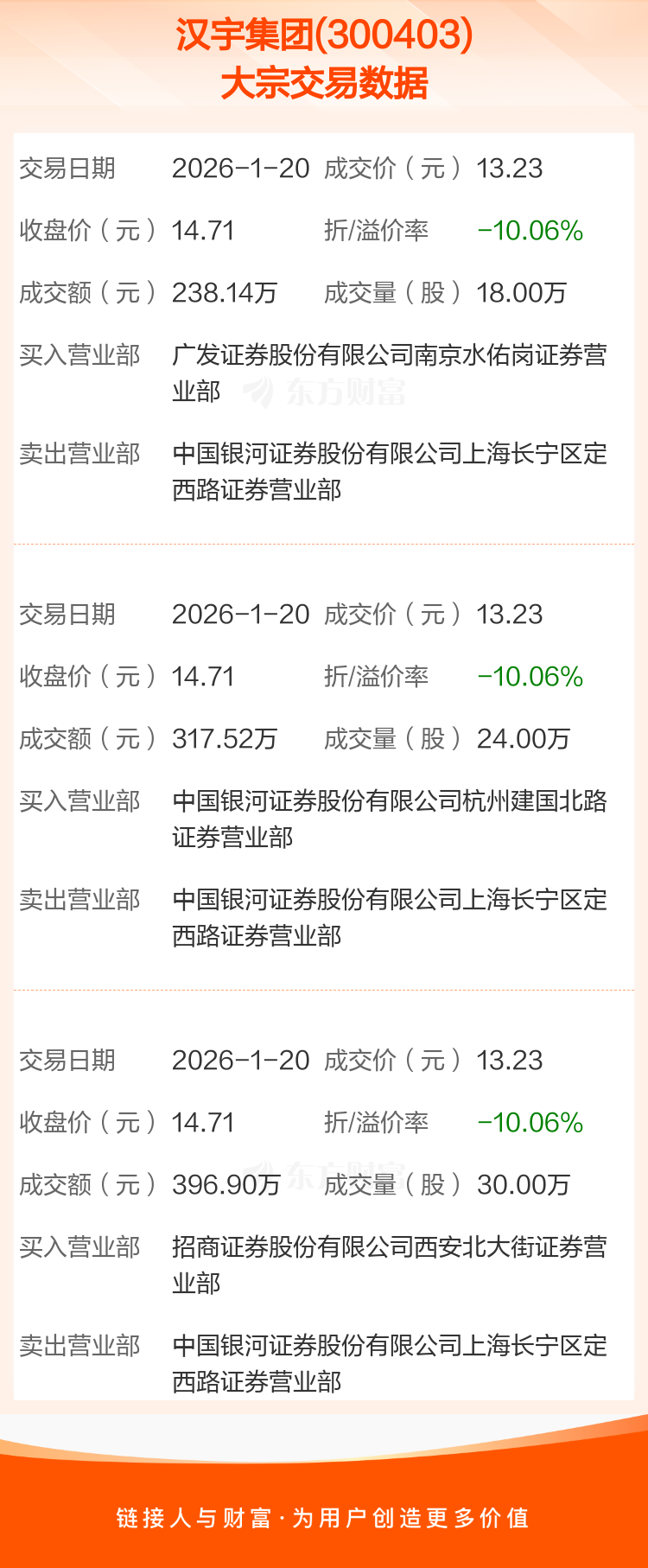 2026年1月20日,汉宇集团发生3笔大宗交易,共成交72.00万股,成交金额952.56万元,占其流通市值比例为0.15%。