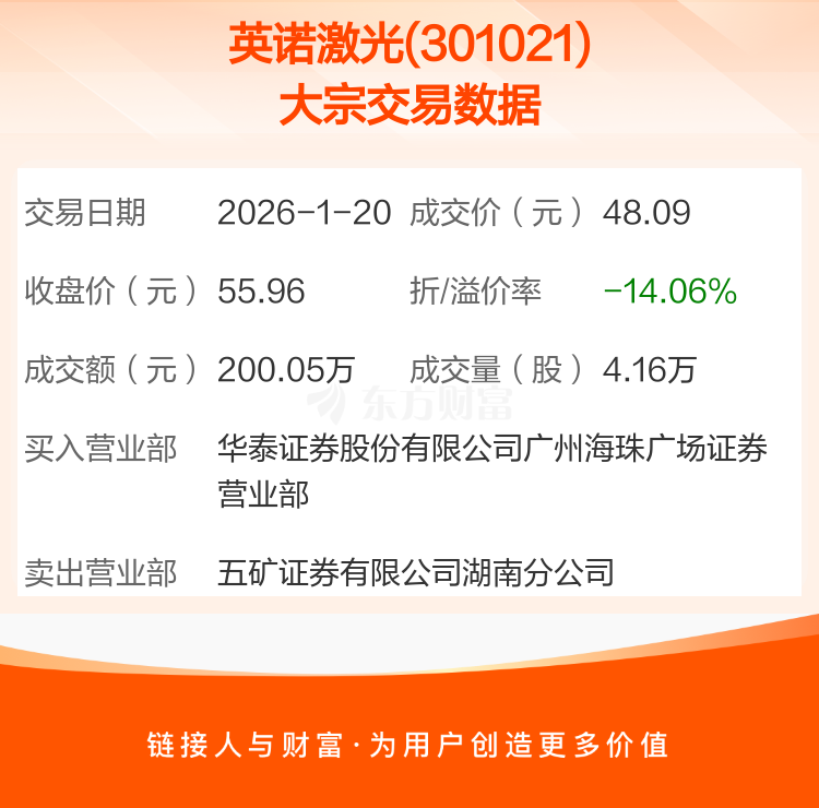 2026年1月20日,英诺激光发生1笔大宗交易,共成交4.16万股,成交金额200.05万元,占其流通市值比例为0.02%。