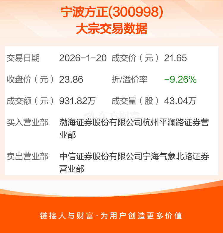 2026年1月20日,宁波方正发生1笔大宗交易,共成交43.04万股,成交金额931.82万元,占其流通市值比例为0.36%。