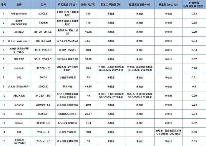 深圳市消费者委员会发布的15款儿童洞洞鞋的检测结果。深圳市消费者委员会文章截图