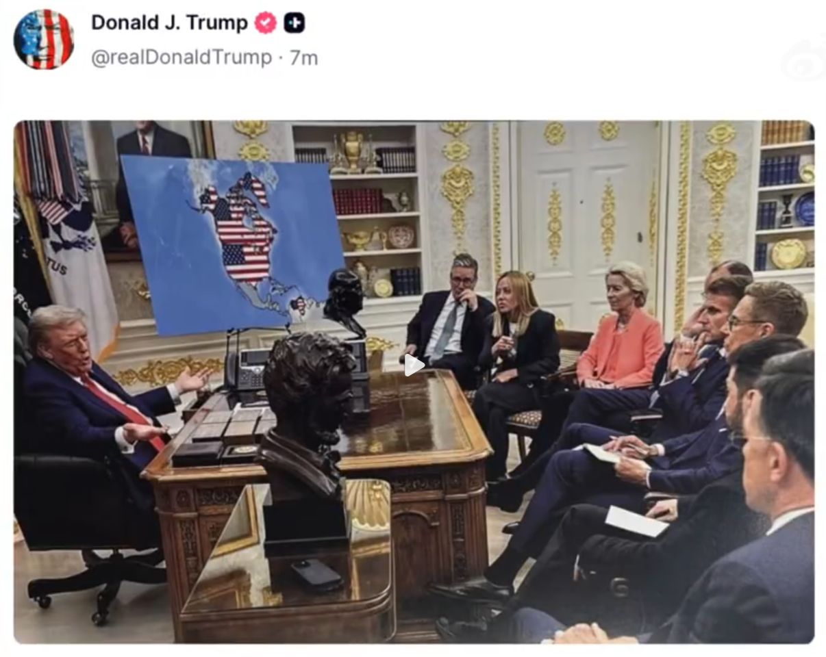 特朗普当天还发布了另一张图片:他在白宫办公室与欧洲领导人会面,后面展板上的地图中,除美国本土外,加拿大、格陵兰岛和委内瑞拉均被美国国旗覆盖。