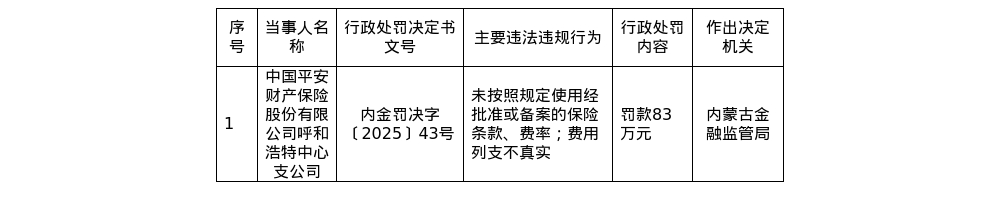 平安财险呼和浩特中支被罚83万,涉费用列支不真实等