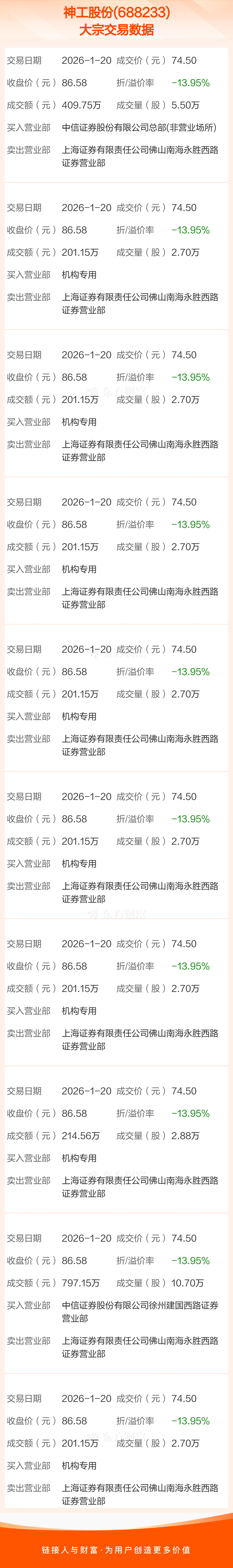 大宗交易:神工股份成交2829.51万元,折价13.95%(1-20)