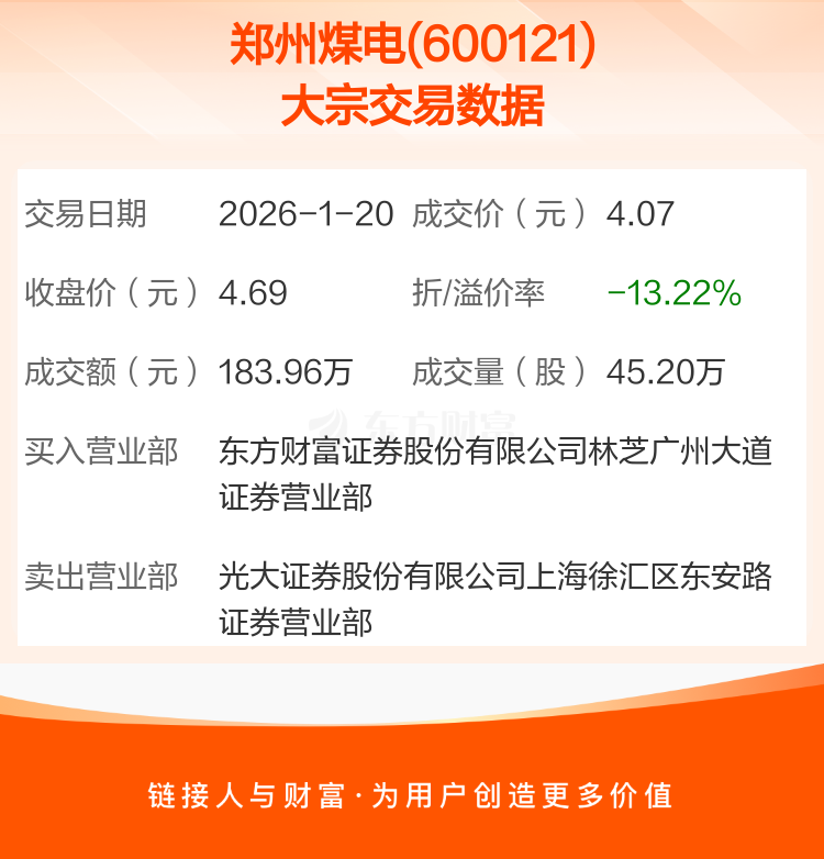 2026年1月20日,郑州煤电发生1笔大宗交易,共成交45.20万股,成交金额183.96万元,占其流通市值比例为0.03%。