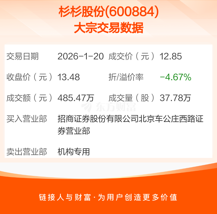 2026年1月20日,杉杉股份发生1笔大宗交易,共成交37.78万股,成交金额485.47万元,占其流通市值比例为0.02%。