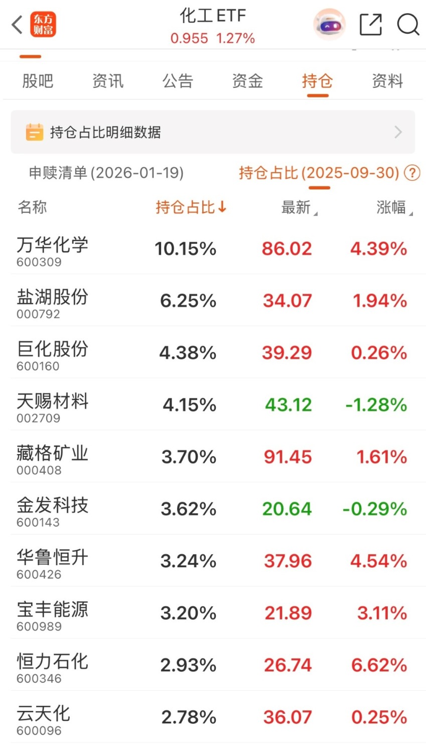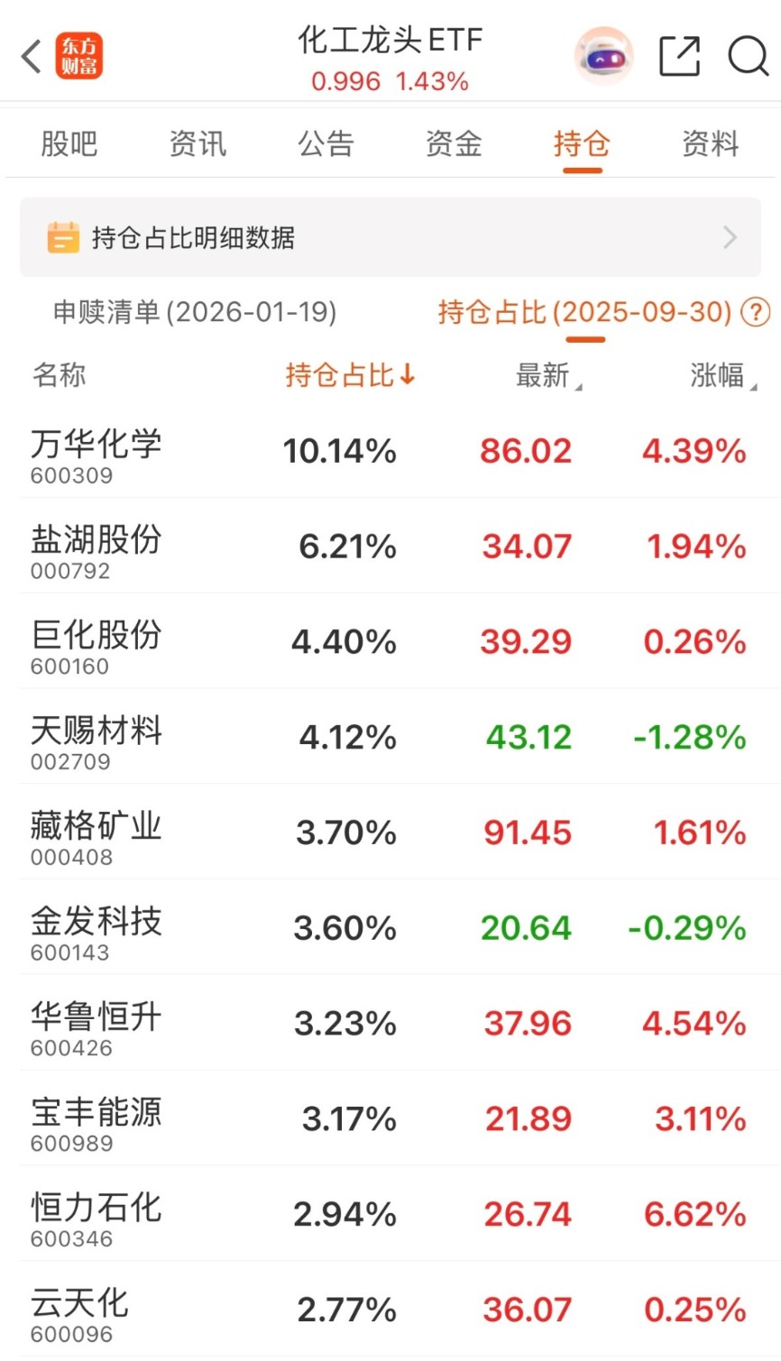 化工龙头ETF(516220)跟踪的是细分化工指数,该指数主要覆盖化学原料、化肥与农用化工品、特种化学品等领域的上市公司证券,最新数据显示,其持有万华化学37.67万股,为第一大重仓股,占净值比例10.14%。