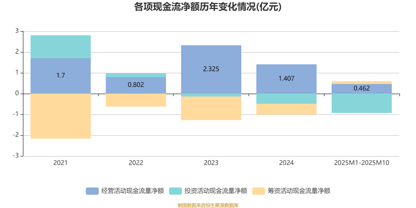 2025年1月至10月,公司经营活动现金流净额为4623.5万元,同比增长4.97%;筹资活动现金流净额1357.1万元,同比增加4395.9万元;投资活动现金流净额-9301.3万元,上年同期为-2589.3万元。
