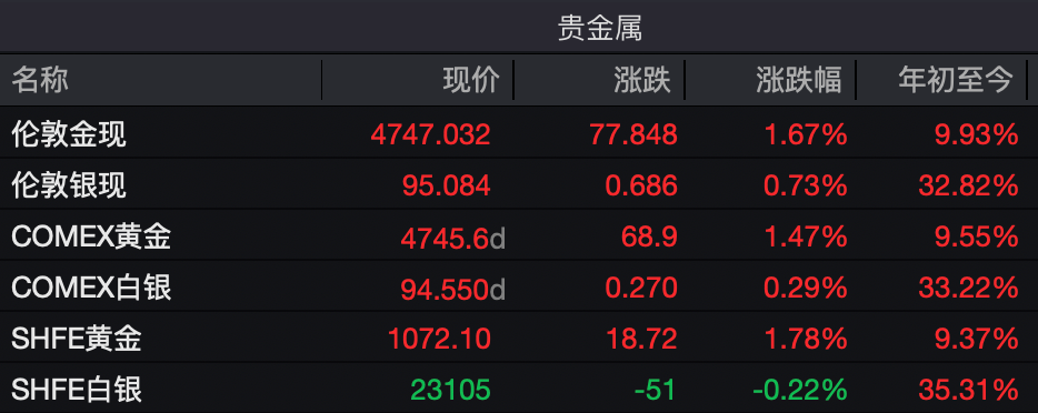 1月20日,美股三大指数大幅低开。现货黄金向上突破,一度涨至4750美元/盎司,续创历史新高,日内涨超1.5%。现货白银站上95美元/盎司,再创新高。
