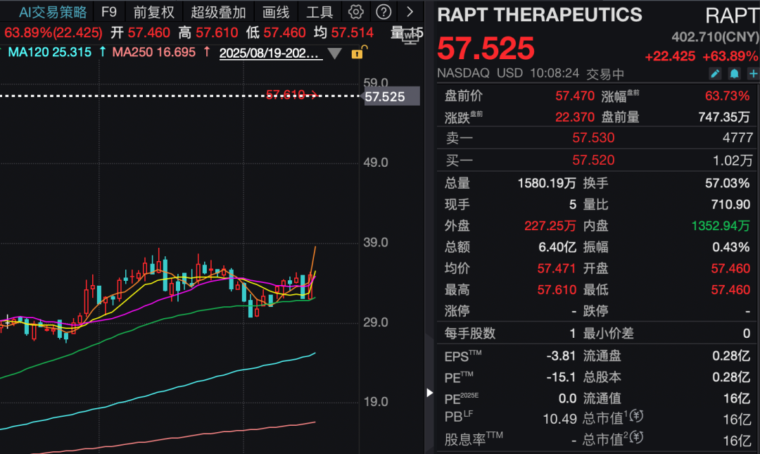 个股方面,RAPT盘中涨逾60%。这家英国制药公司周二宣布获葛兰素史克收购,交易价格每股58美元,较周一收盘价溢价65%,整笔交易折合股权价值22亿美元。交易完成后,GSK将获得食物过敏药物ozureprubart的全球(不包含大中华区)权利,并将负责向上海济煜医药支付里程碑款项。