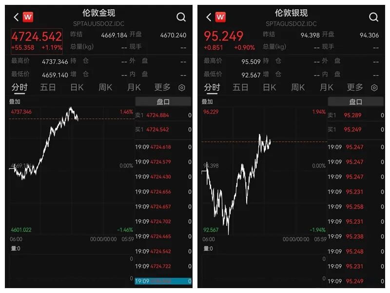 近期,黄金、白银涨势持续。Wind数据显示,北京时间1月20日,现货黄金和现货白银继续刷新纪录,现货黄金一度突破4730美元/盎司,现货白银突破95美元/盎司。截至19:09,现货黄金报4724.542美元/盎司,现货白银报95.249美元/盎司。