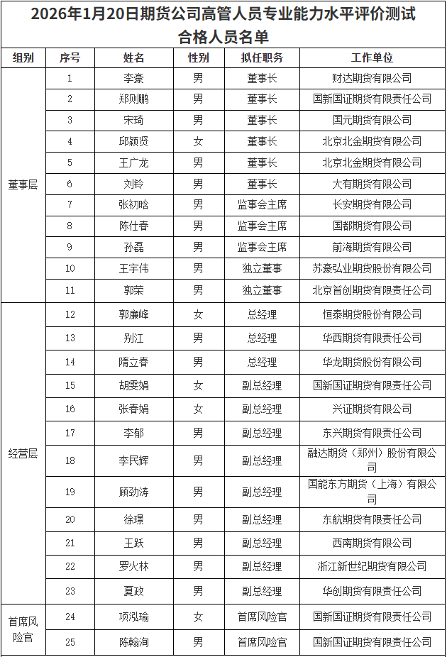 上证报中国证券网讯中国期货业协会最新发布“2026年1月20日期货公司高管人员专业能力水平评价测试合格人员名单”,财达期货拟任董事长李豪,国新国证期货拟任董事长郑则鹏,国元期货拟任董事长宋琦,北京北金期货拟任董事长邱颖贤、王广龙,大有期货拟任董事长刘铃通过测试。同时通过测试的还有恒泰期货拟任总经理郭廉峰、华西期货拟任总经理别江、华龙期货拟任总经理隋立春。