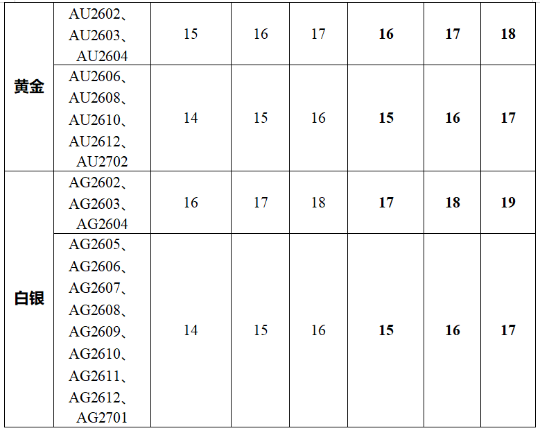 黄金期货AU2606、AU2608、AU2610、AU2612、AU2702合约涨跌停板幅度调整为15%,套保持仓交易保证金比例调整为16%,一般持仓交易保证金比例调整为17%;