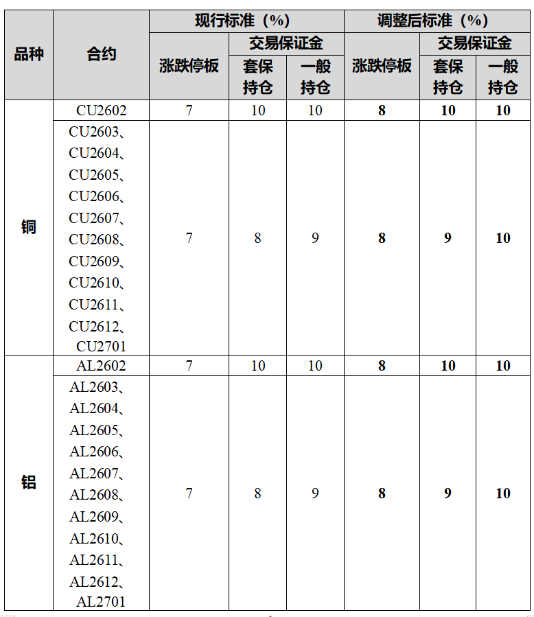 铜期货已上市合约的涨跌停板幅度调整为8%,套保持仓交易保证金比例调整为9%,一般持仓交易保证金比例调整为10%;