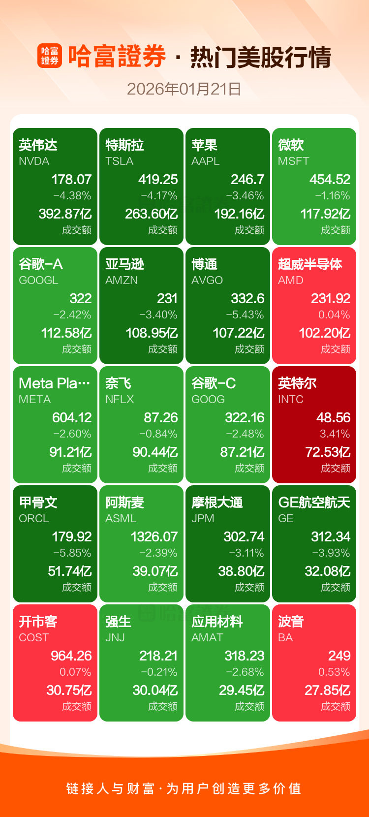 英伟达跌4.38%,特斯拉跌4.17%,苹果跌3.46%,微软跌1.16%,谷歌-A跌2.42%,亚马逊跌3.40%,博通跌5.43%,超威半导体涨0.04%,Meta Platforms Inc-A跌2.60%,奈飞跌0.84%。