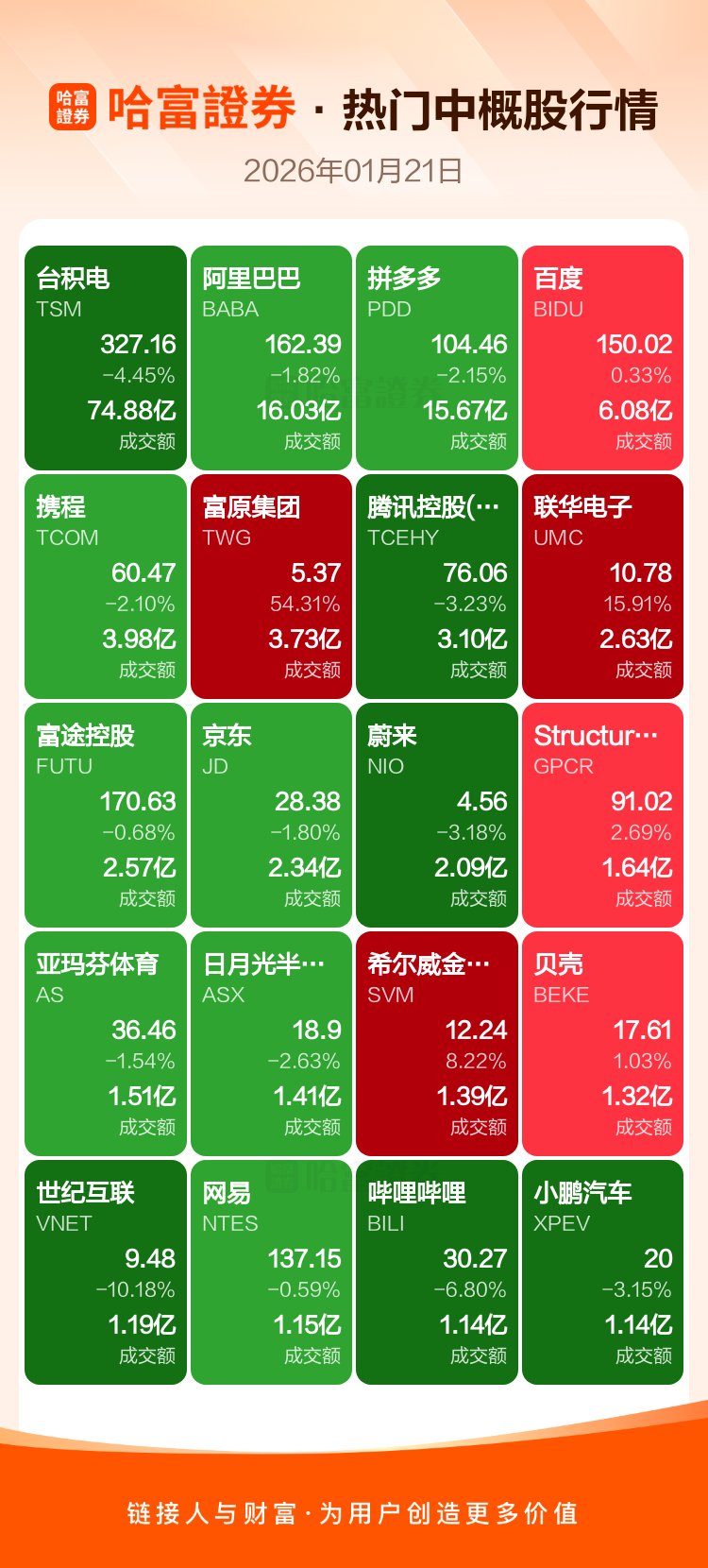 台积电跌4.45%,阿里巴巴跌1.82%,拼多多跌2.15%,百度涨0.33%,携程跌2.10%,富原集团涨54.31%,腾讯控股(ADR)跌3.23%,联华电子涨15.91%,富途控股跌0.68%,京东跌1.80%。