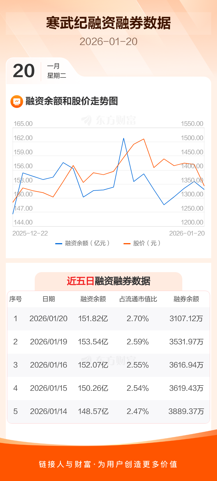 交易所最新数据显示,寒武纪于2026年1月20日获融资买入11.15亿元,融资偿还12.87亿元,当日融资净偿还1.72亿元。目前,该股融资余额151.82亿,占流通市值比例为2.70%。